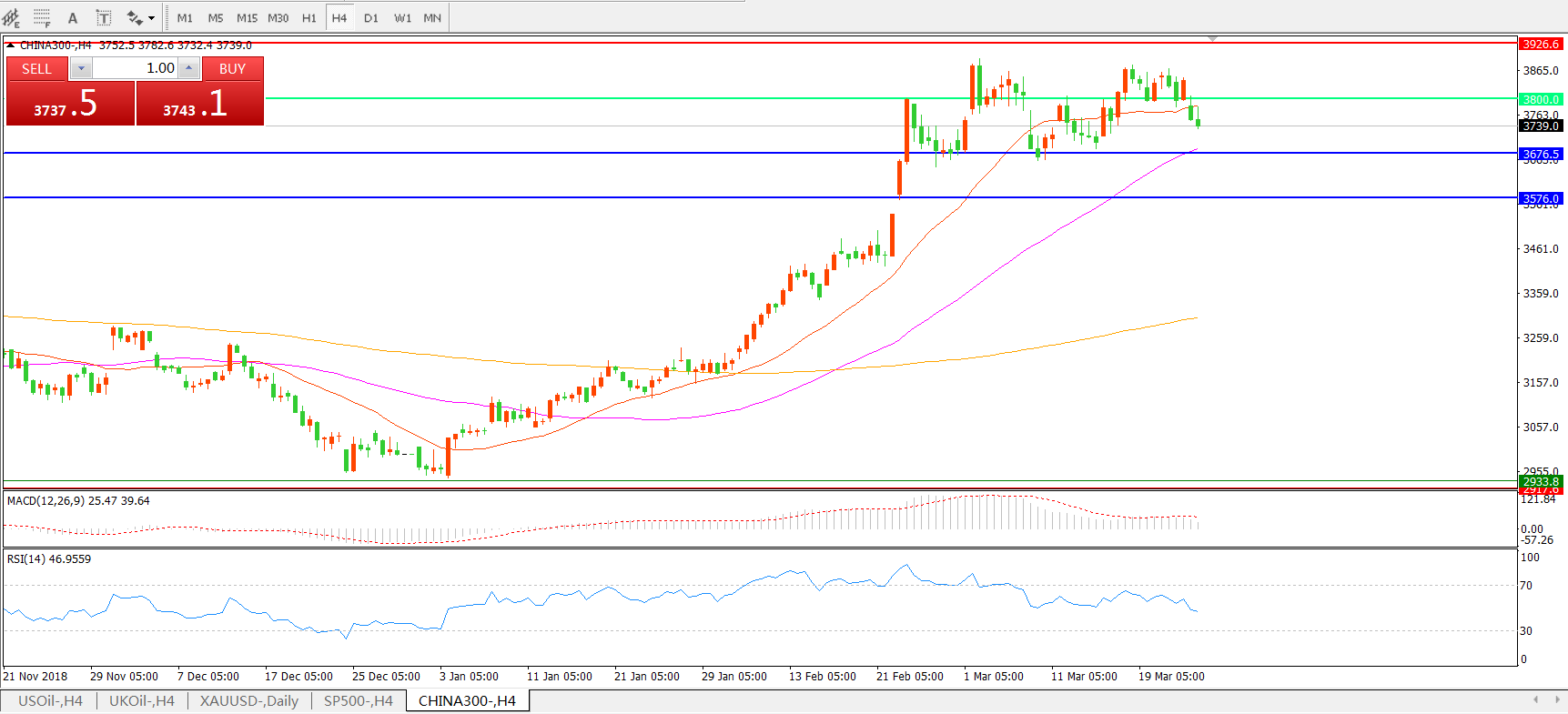 4小时图看,中华指数CHINA300高位盘整后出现大幅回落,整体走势陷入盘整,短期均线系统被跌破,55均线成为下一支撑, MACD红柱减少,RSI指标拐头向下,延续下行概率较大。