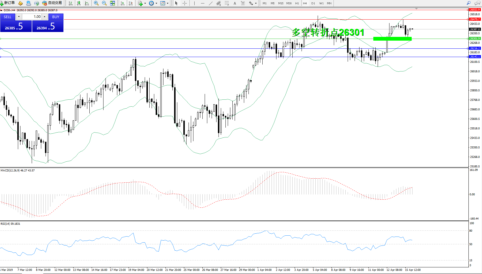 道琼斯指数DJ30—— 4小时K线图显示: