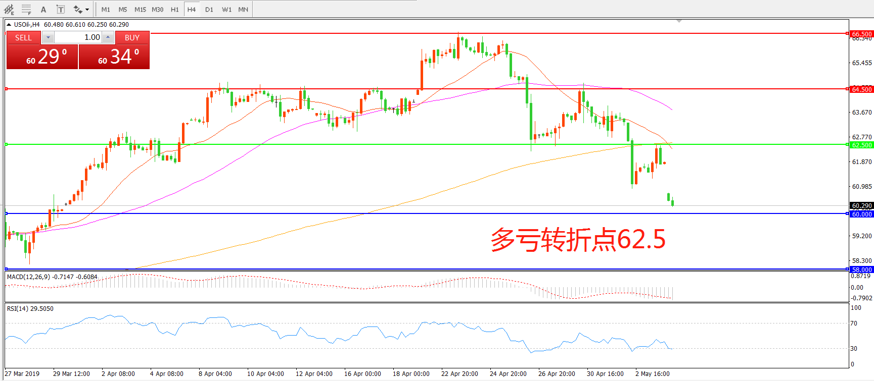 交易策略: 在62.50之下看跌,目标60.00    58.00
