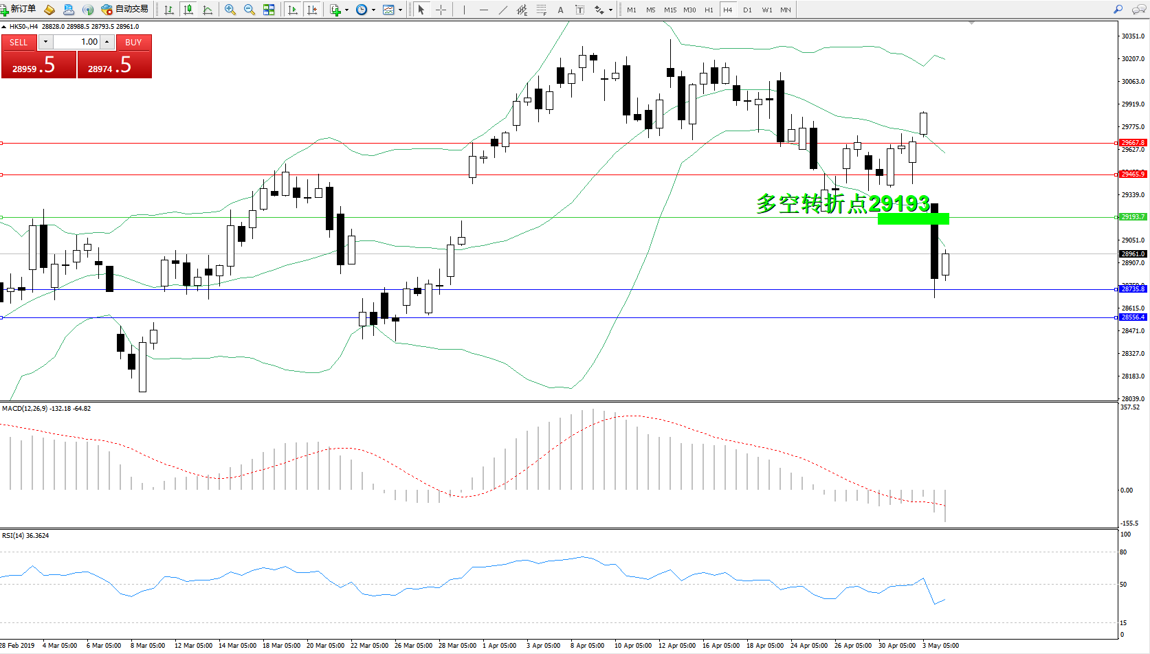 恒指HK50 ——4小时K线图显示: