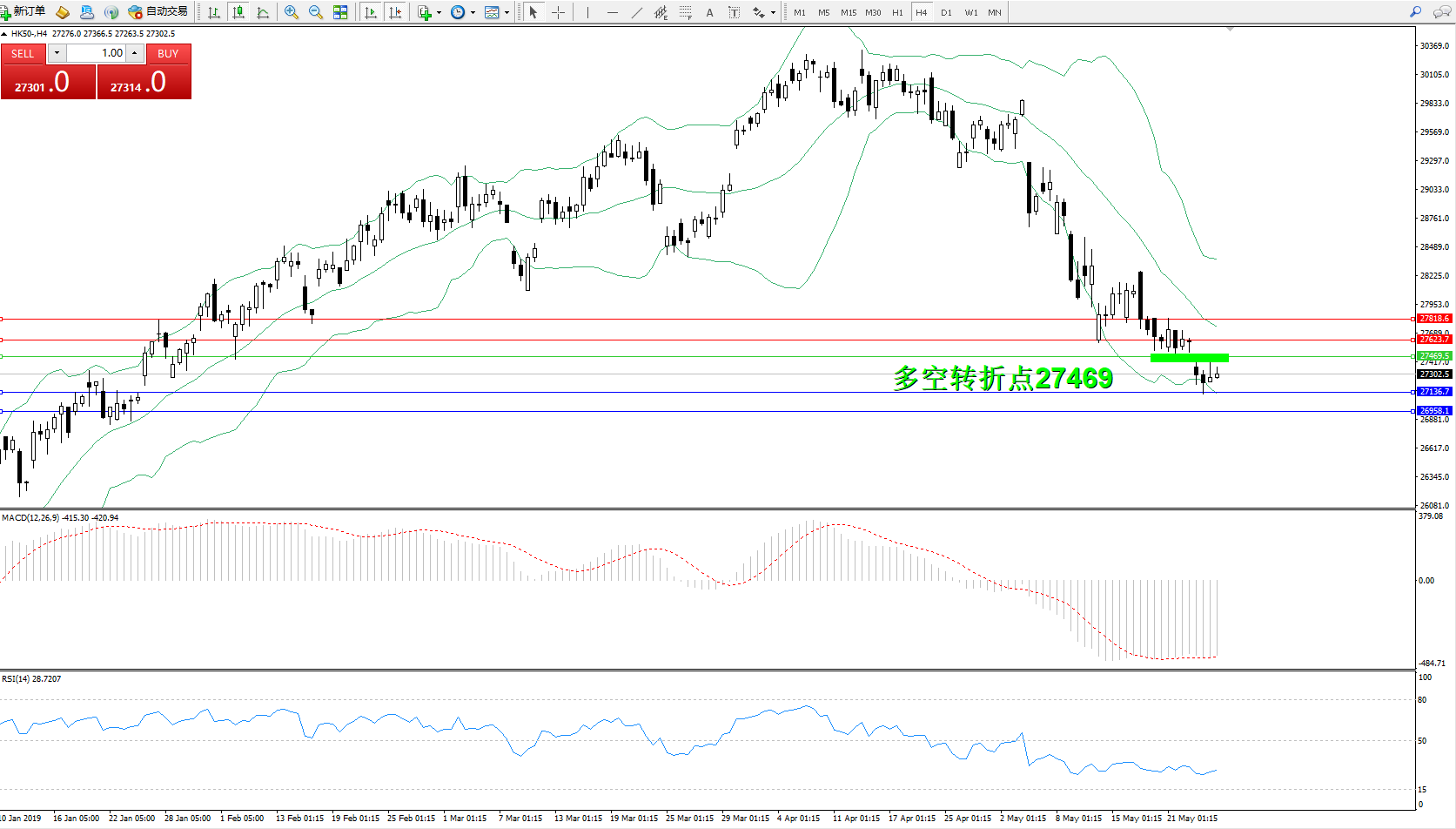恒指HK50 ——4小时K线图显示: