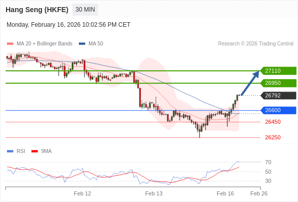 香港恒生指数期货 当日内: 朝26950运行。