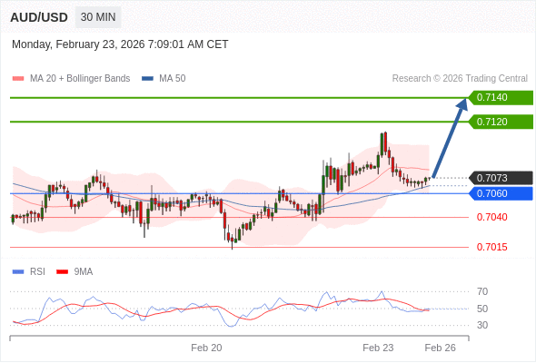 在 0.7060 之上,看涨,目标价位为 0.7120 ,然后为 0.7140 。