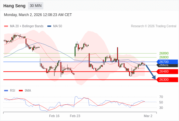 在 26700 之下,看跌,目标价位为 26480 ,然后为 26300 。