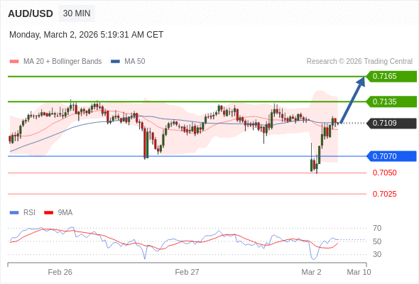 在 0.7070 之上,看涨,目标价位为 0.7135 ,然后为 0.7165 。