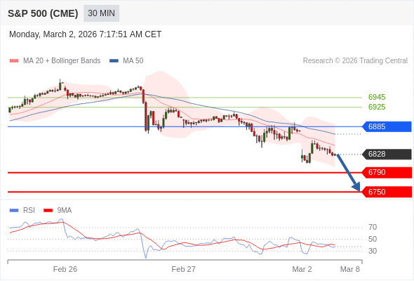 美国标普500指数期货 (H6) 当日内: 存在压力。