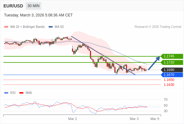 在 1.1670 之上,看涨,目标价位为 1.1720 ,然后为 1.1745 。