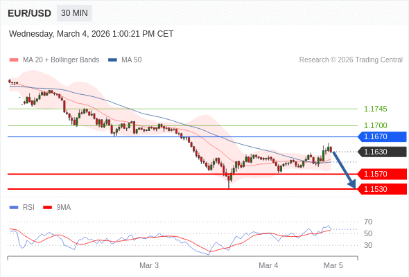 交易策略: 在 1.1670 之下,看跌,目标价位为 1.1570 ,然后为 1.1530 。
