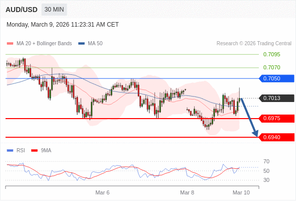 交易策略: 在 0.7050 之下,看跌,目标价位为 0.6975 ,然后为 0.6940 。