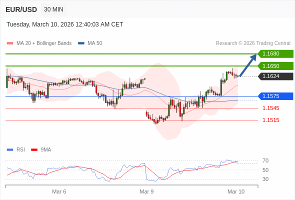 在 1.1575 之上,看涨,目标价位为 1.1650 ,然后为 1.1680 。