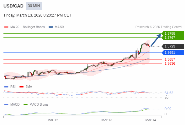技术点评: RSI技术指标大于中性区域50。 MACD技术指标处在其信号线之上看多。 配置为正。 此外,价位高于其20天及50天移动平均线 ( 分别位于1.3701 和1.3664 )。