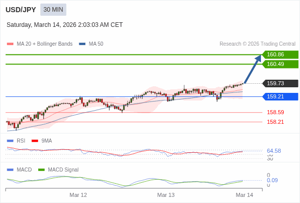 美元/日元 当日内 : 看涨,当 159.21 为支撑位。