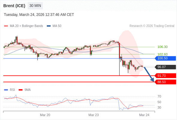 交易策略: 在 100.50 之下,看跌,目标价位为 91.70 ,然后为 88.50 。