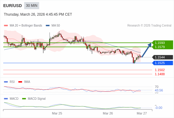 欧元/美元 当日内 : 有上涨的可能,目标价位定在 1.1593 。