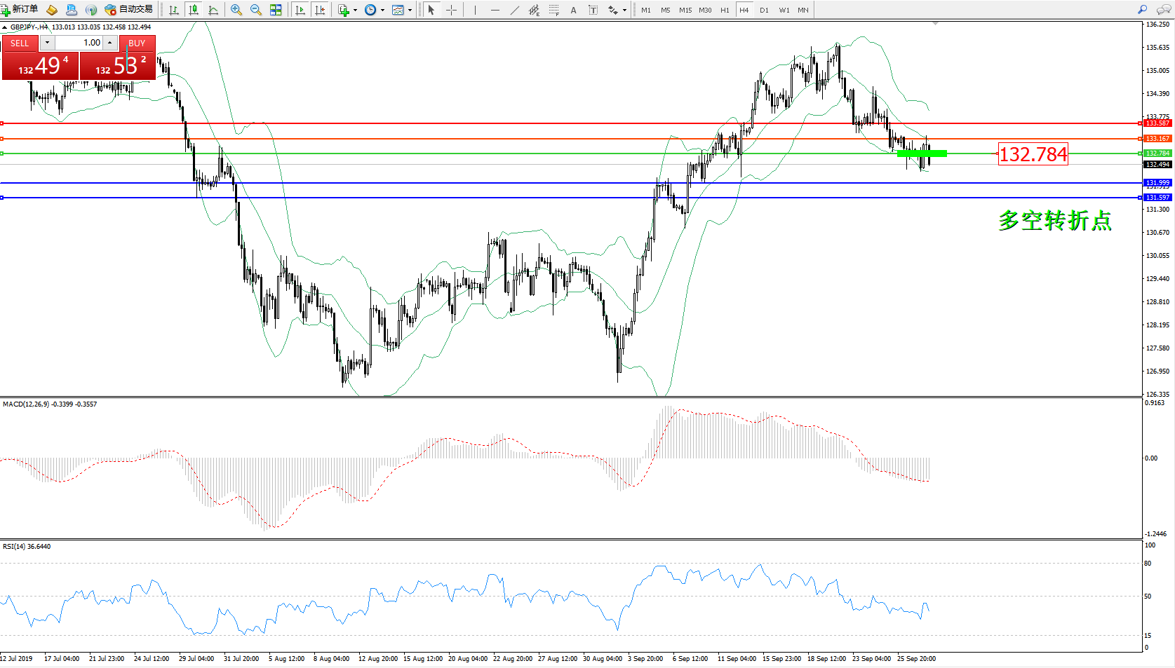 交易策略:132.784下方看跌,目标131.999、131.597
