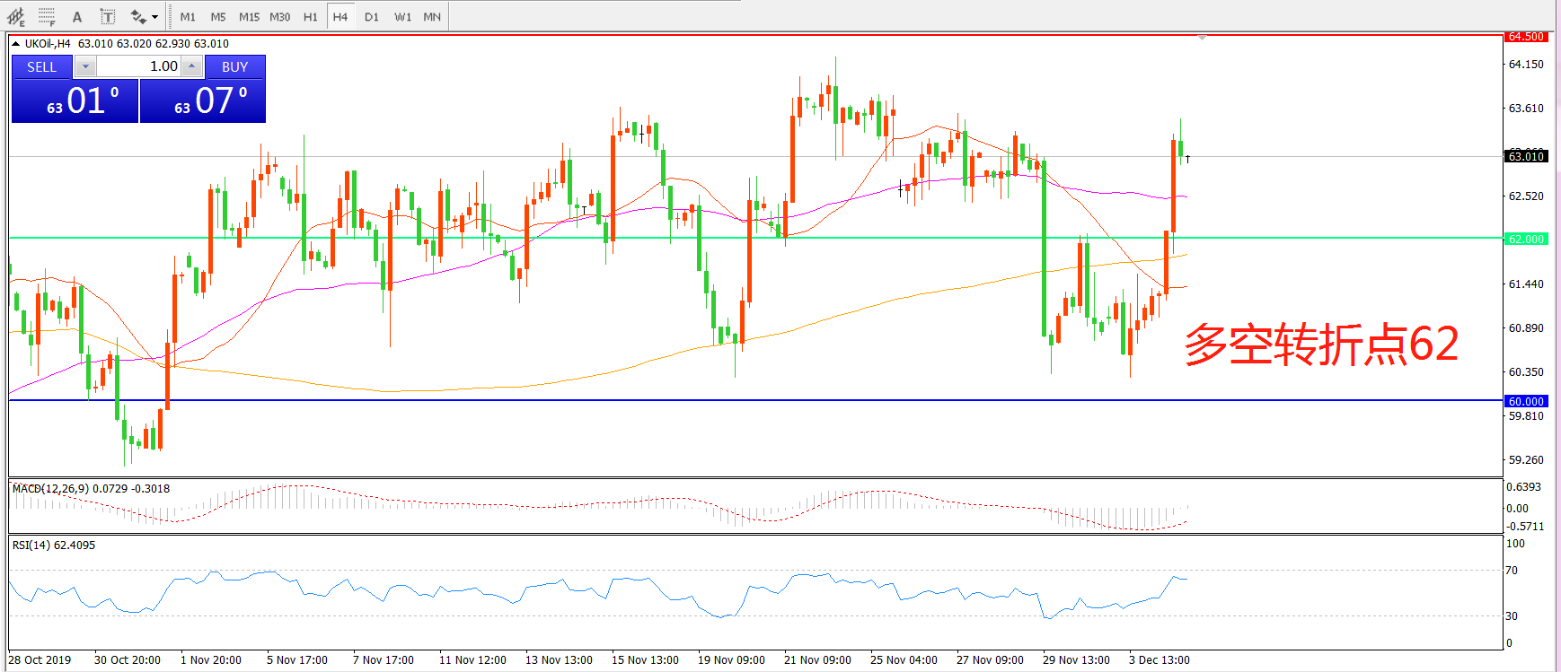 交易策略:在62.00之上看涨,目标64.50     66.00