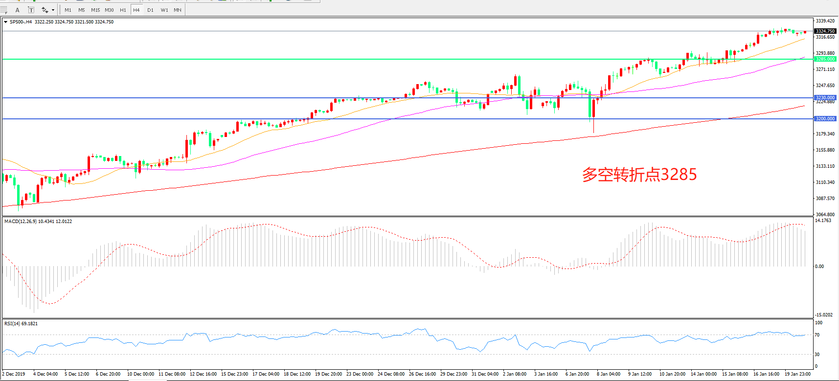 4小时图看,标普500阳线连续拉升,整体走势偏强,均线系统呈多头排列,MACD红柱增加,RSI指标向上,日内延续上行概率较大。