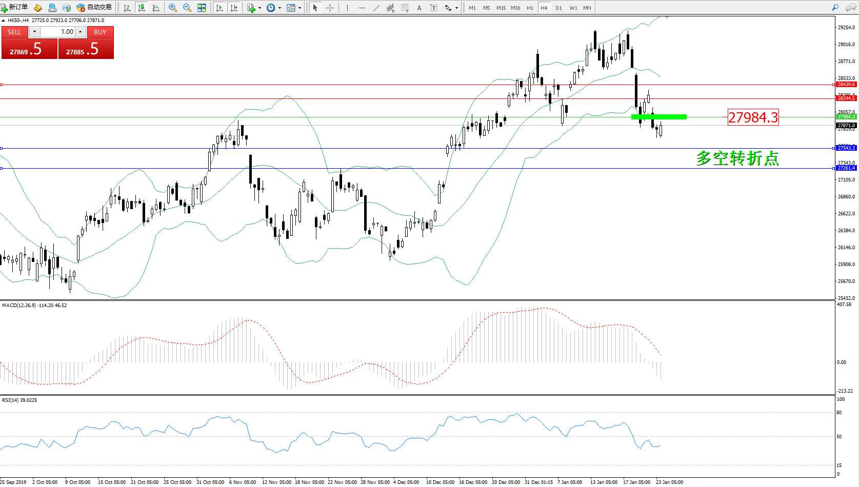 恒指HK50 ——4小时K线图显示: