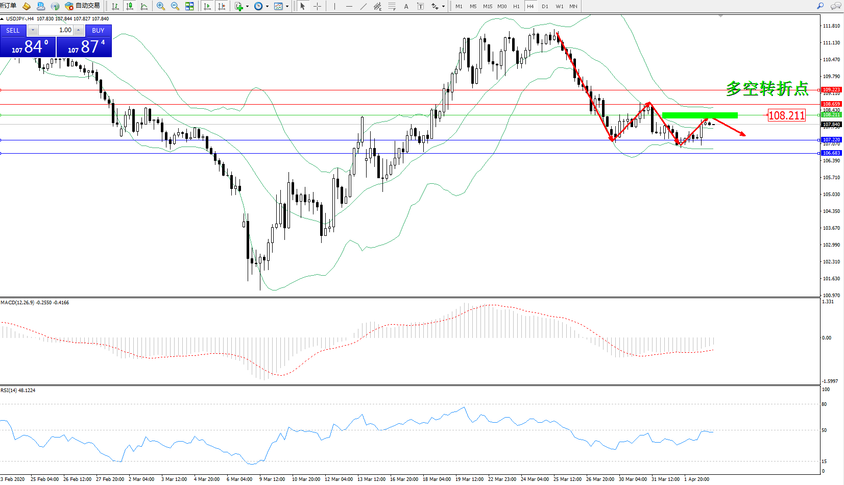 交易策略:108..211下方看跌,目标107.220、106.683