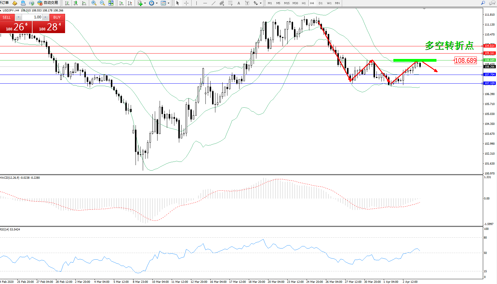 交易策略:108.689下方看跌,目标107.704107.109