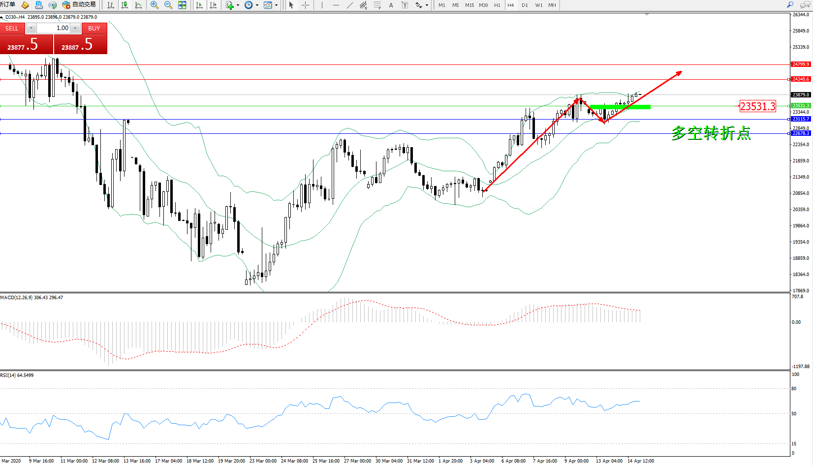 道琼斯指数414日(周二)收盘上涨559.00点,涨幅2.39%,报23949.76点。周二美国股市上涨,因有迹象显示冠状病毒疫情正在平稳或缓和,而阴云密布的财报季首批财报即将出炉之际,交易员们也在掂量权衡。日常消费品板块领涨,其次是非日常生活消费品板块和信息技术板块;伴随着油价下跌,能源板块是唯一下跌的板块。工厂停工、供应链进一步中断以及封锁期间大多数商品的消费者需求下降,都预示着4月份经济将进一步萎缩,预计4月制造业活动总体水平较疫情前下降约25%,创二战结束以来最大的产出降幅。此外预计4月建筑业活动下降约30%。特朗普总统未来几天将就重新开放经济的指引发布“重要公告”;随后股市扩大涨幅。随着财报季的到来,投资者将了解这种流行病可能对全球公司造成的严重打击。