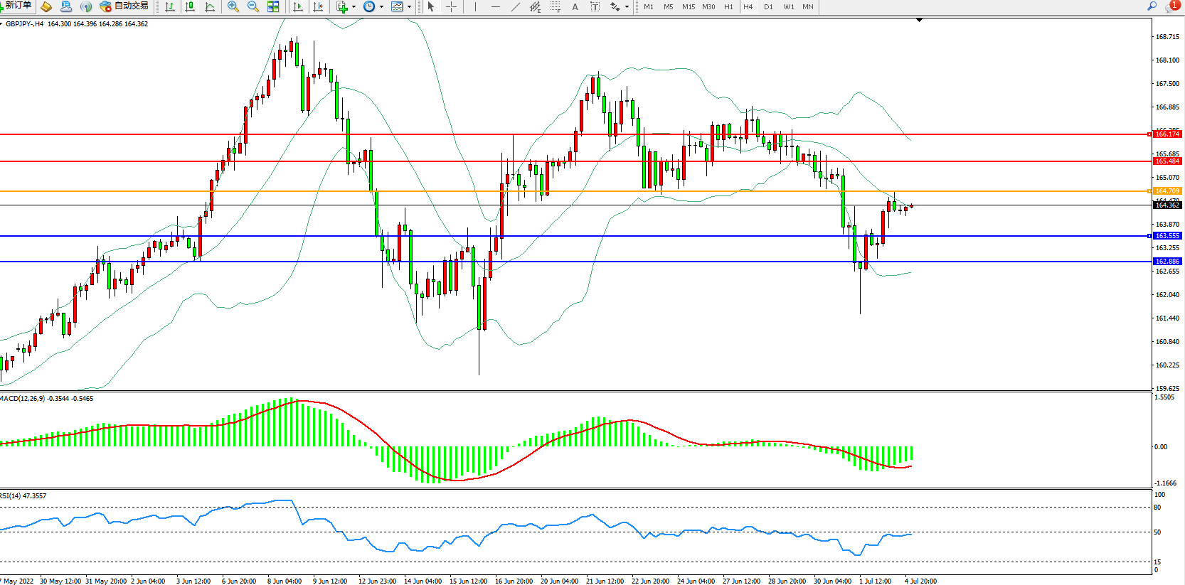 交易策略:164.709下方看跌,目标163.555、162.886