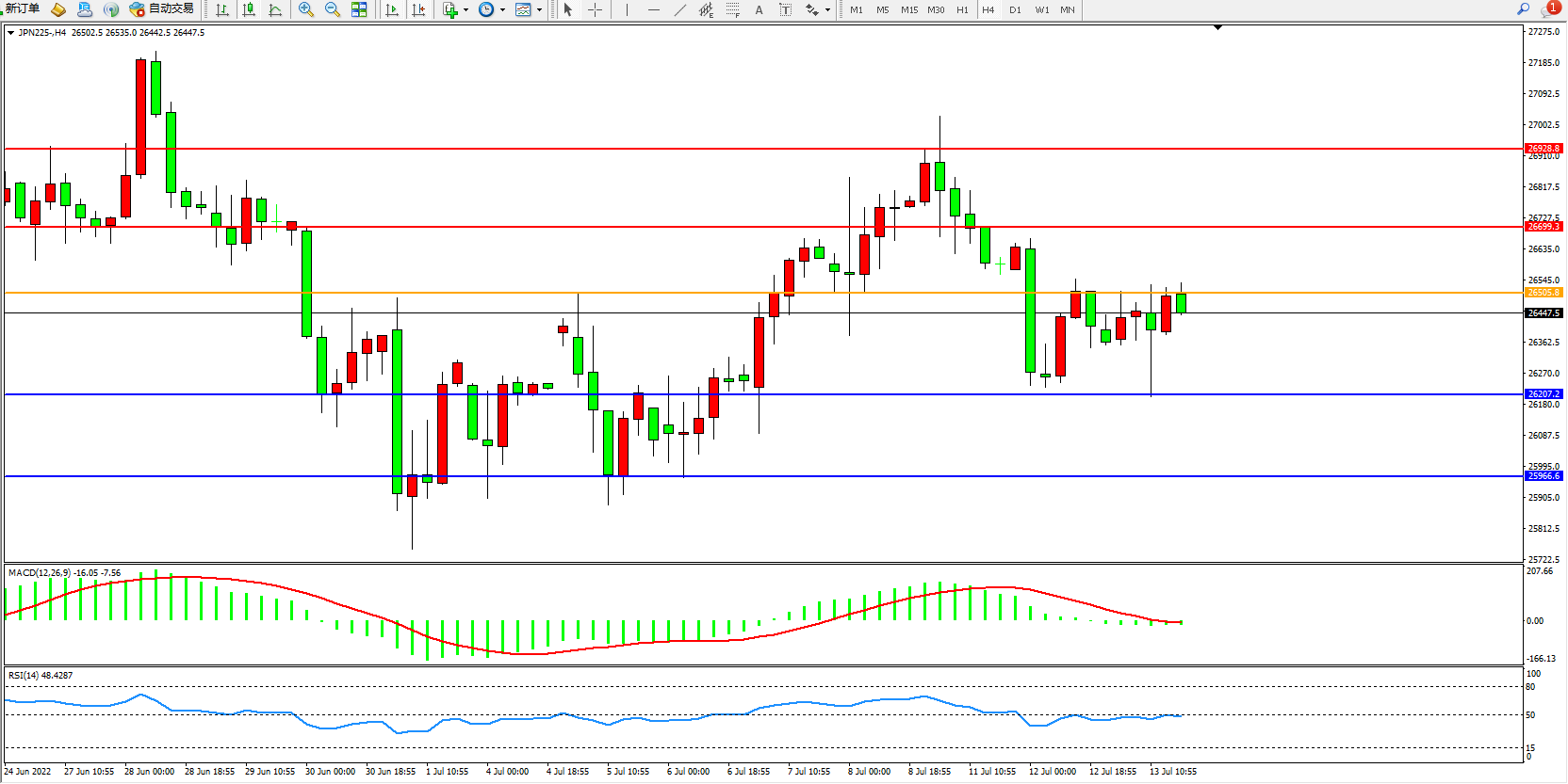 日经指数JPN225——4小时K线图显示: