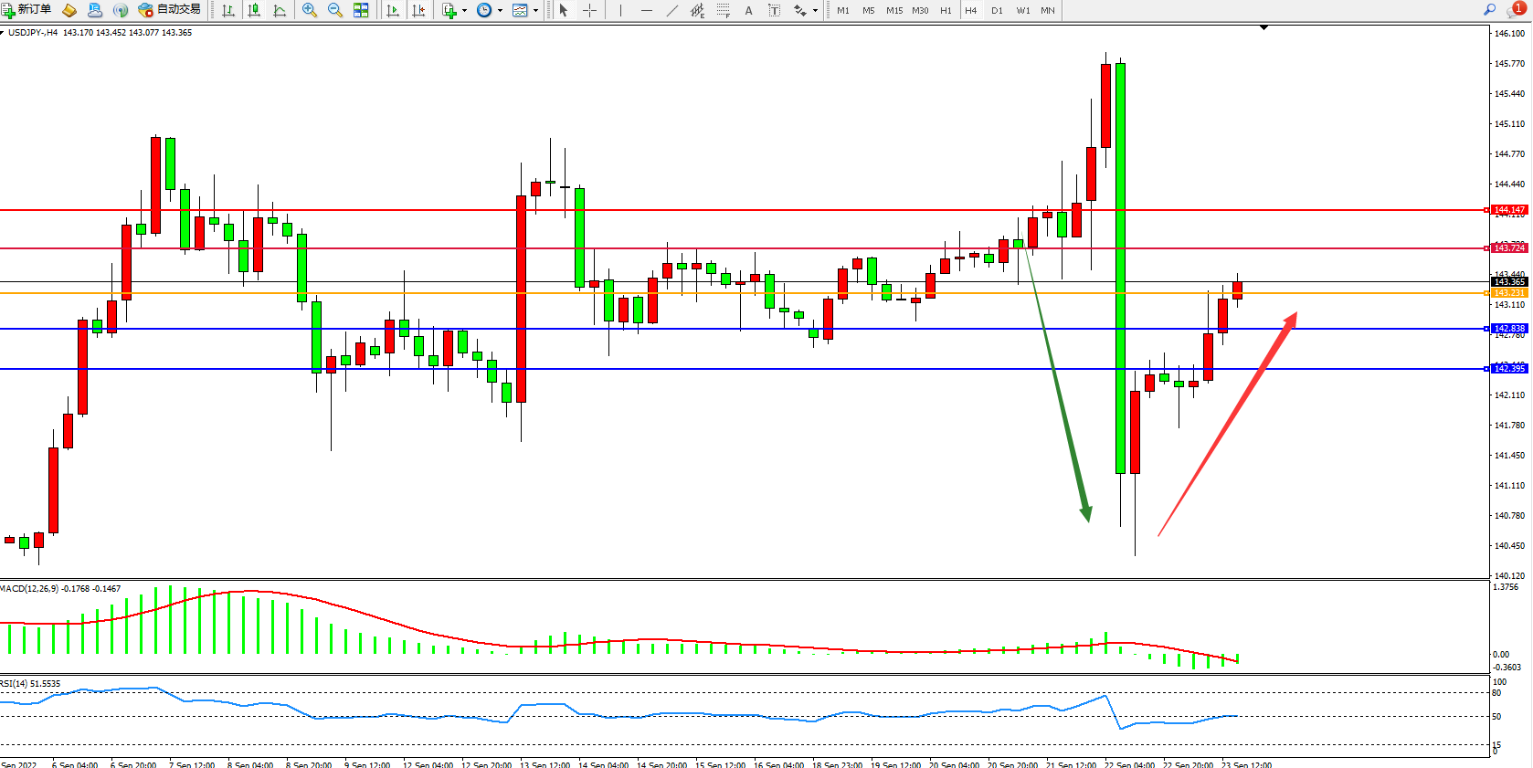 备选策略:143.231下方看跌,目标142.838、142.395