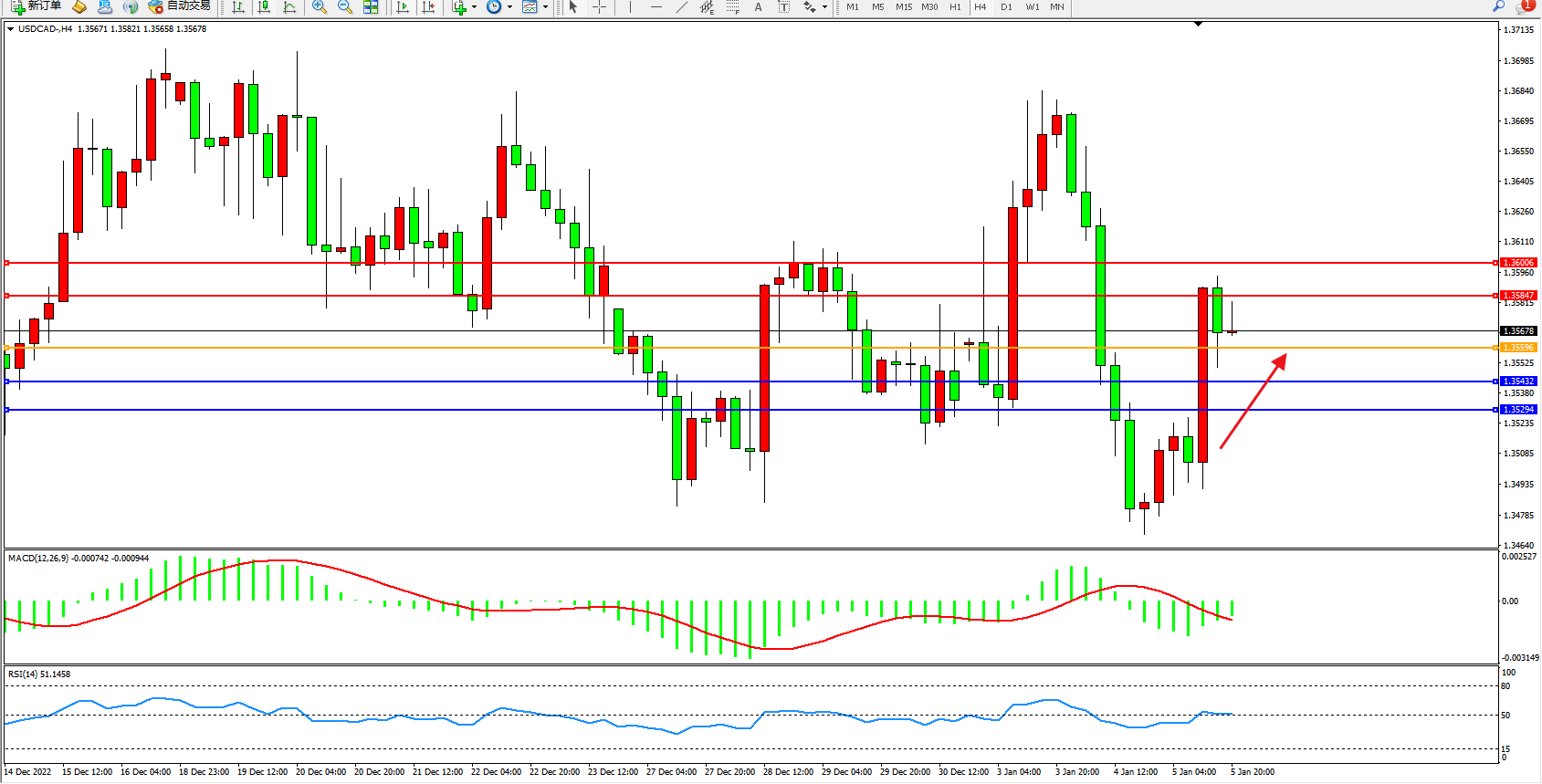 美元加元USDCAD——4小时K线图显示: