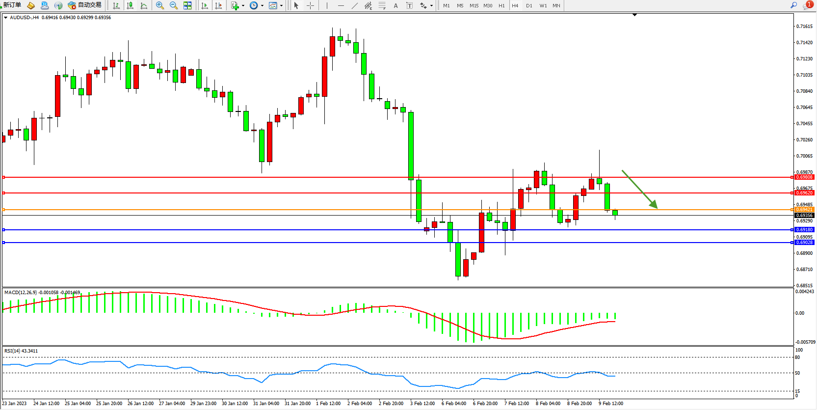 交易策略:0.69421下方看跌,目标0.69180、0.69028