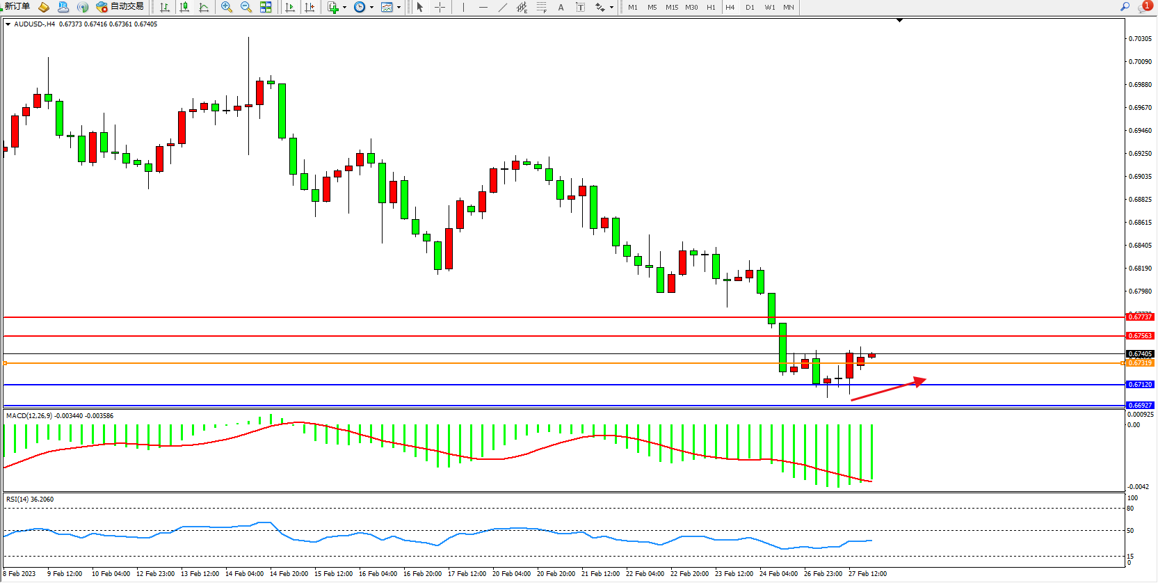 交易策略:0.67319上方看涨,目标0.67563、0.67737