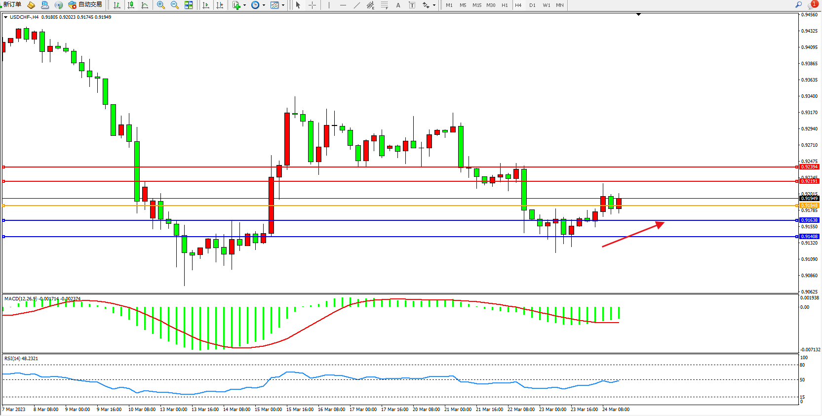 交易策略:0.91848上方看涨,目标0.92191  0.92394