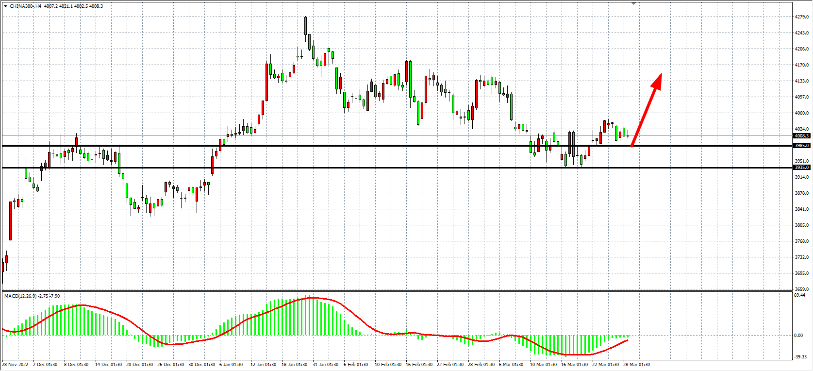 4小时图看,沪深300在4020附近呈小幅整理,MACD在零轴之下即将上穿,整理形态明显,当前支撑关注3985,在3985之上看涨4050-4120。