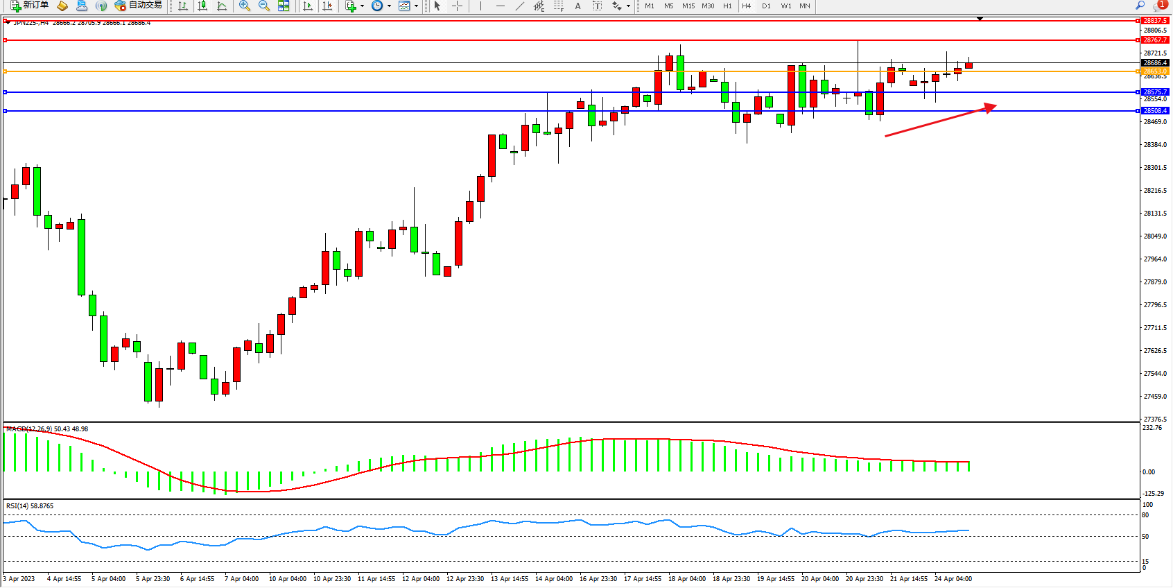 日经指数JPN225——4小时K线图显示: