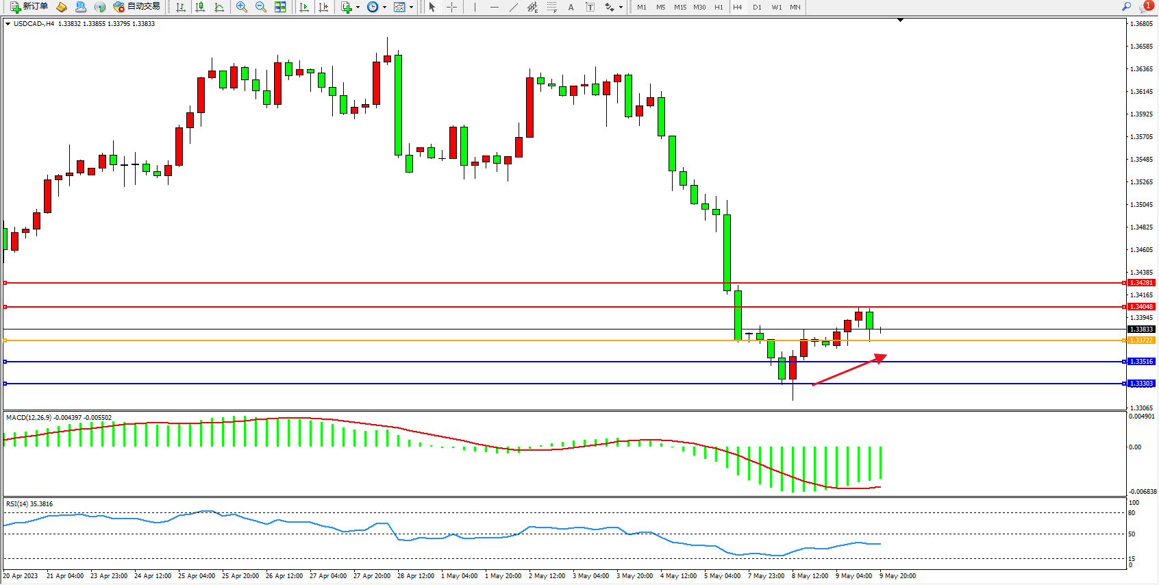 美元加元USDCAD——4小时K线图显示: