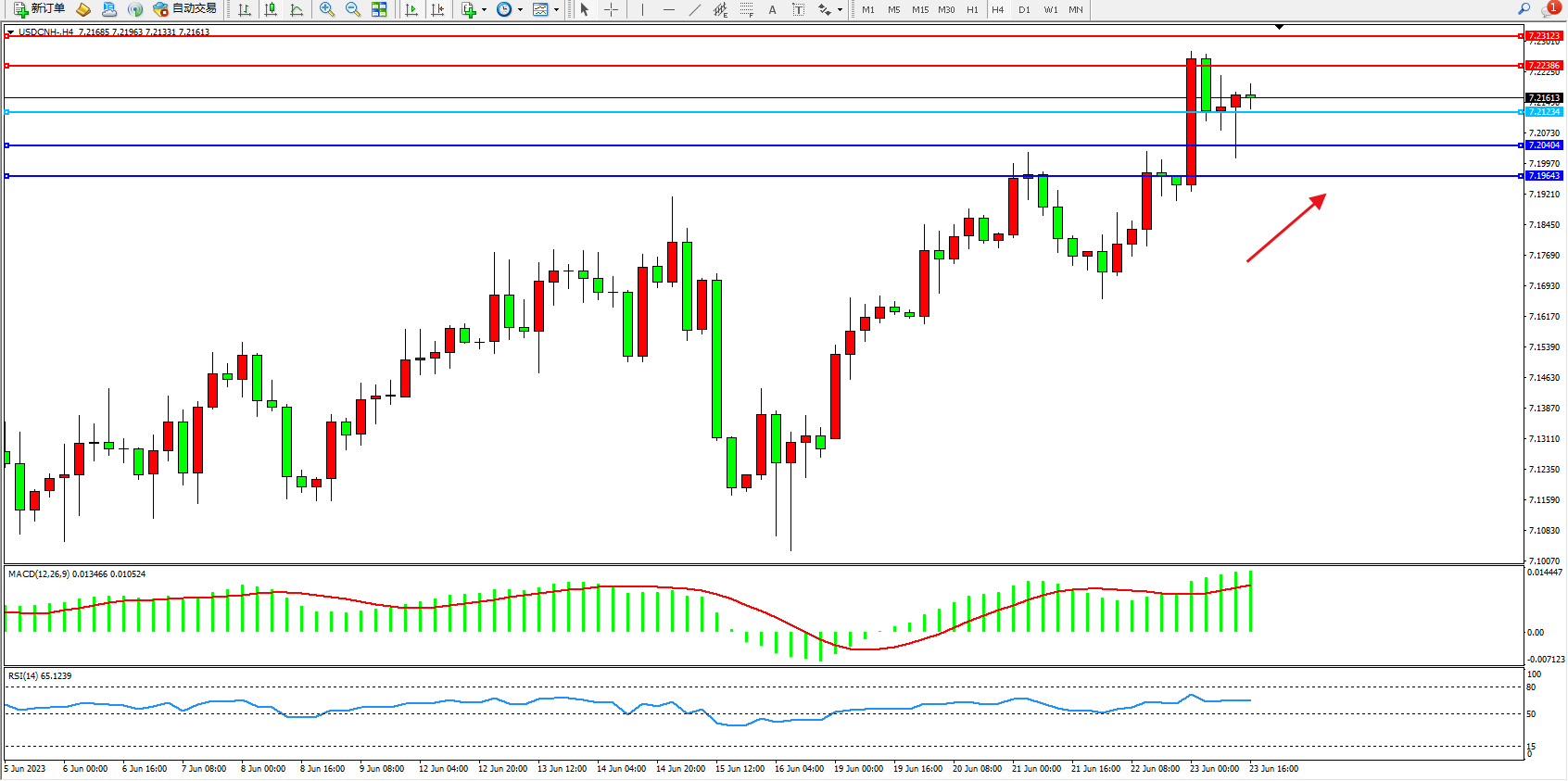 美元人民币USDCNH——4小时K线图显示: