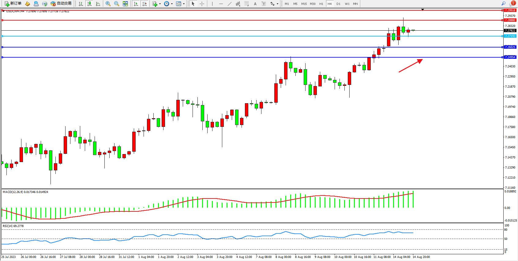 美元人民币USDCNH——4小时K线图显示: