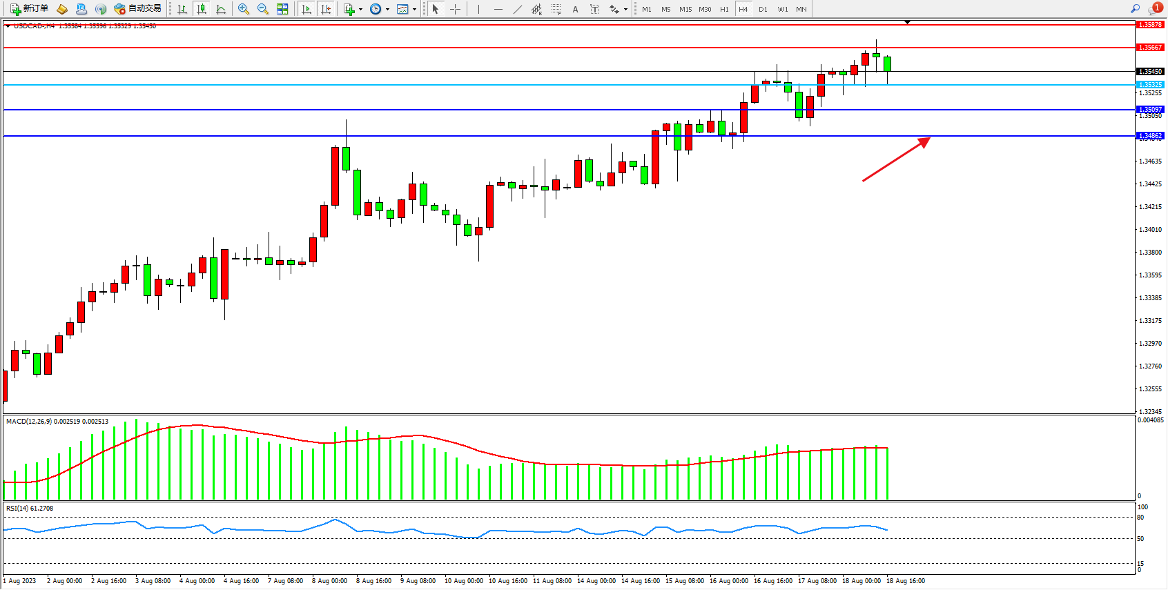 美元加元USDCAD——4小时K线图显示:
