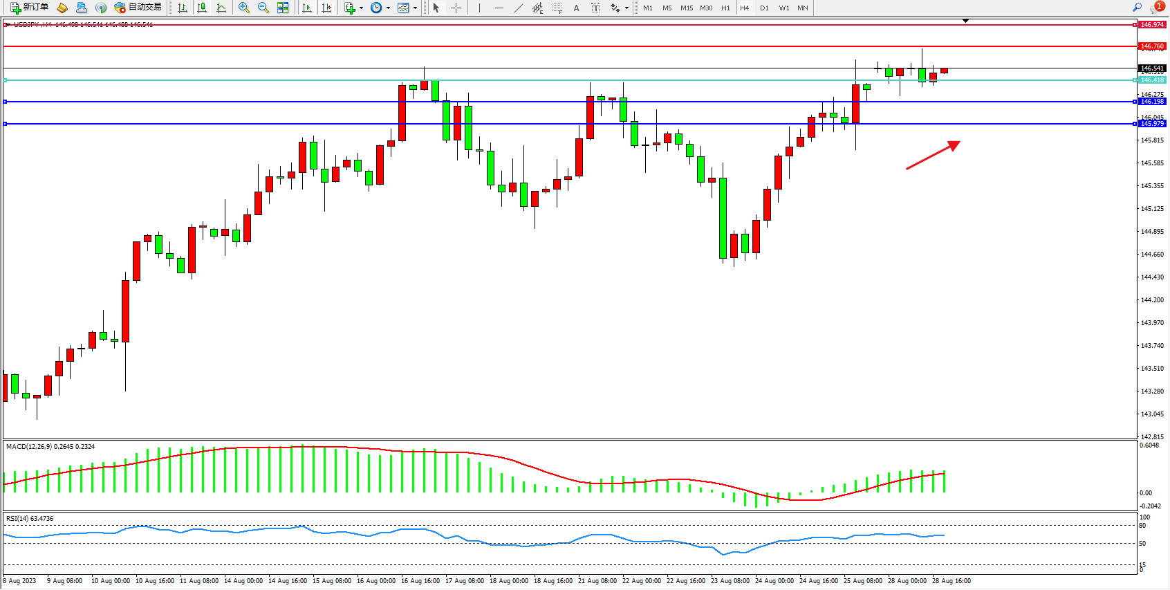 交易策略:146.418上方看涨,目标146.760  146.974