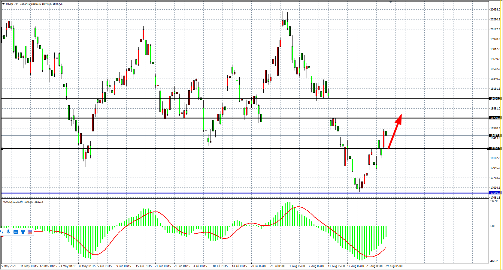 交易策略:18250 上方看涨,目标 18730 19030