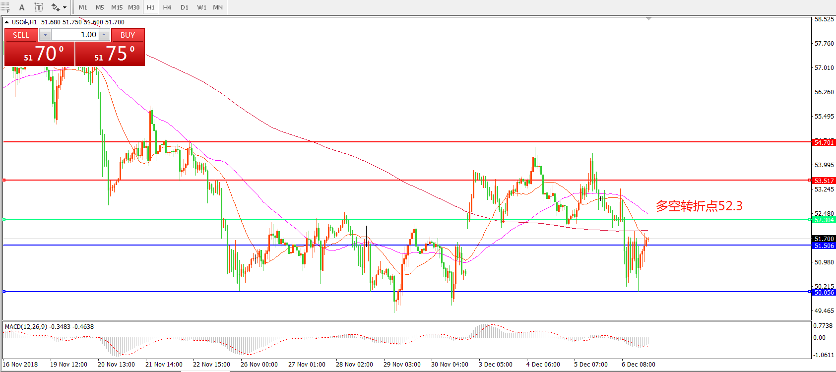 小时图看,油价回落后跌破前期支撑,稍后虽有反弹但整体位于52.3之下,短期均线走平,MACD绿柱缩短,短期内震荡整理概率较大。