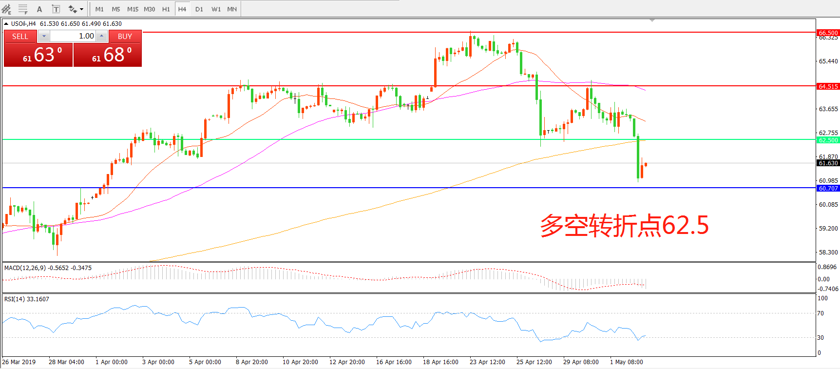 交易策略: 在62.50之下看跌,目标60.00 58.00