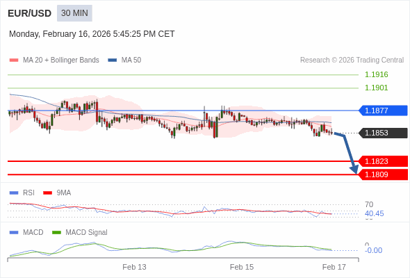 欧元/美元 当日内 : 看跌,在 1.1877 之下。