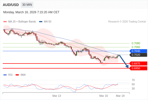在 0.7040 之下,看跌,目标价位为 0.6975 ,然后为 0.6950 。