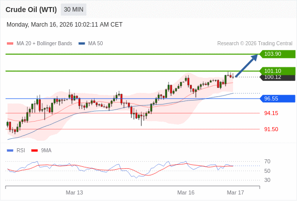 在 96.55 之上,看涨,目标价位为 101.10 ,然后为 103.90 。
