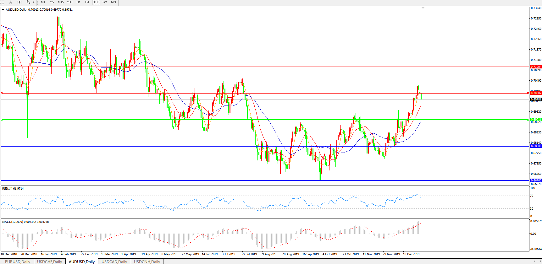 技术面简析:日图均线整体呈多头排列,汇价昨日冲高乏力后跌破0.70关口,MACD继续上攻且量能充足,RSI开始小幅走弱,短线关注0.70关口的争夺,预计汇价大概率将在整理后进一步走高。