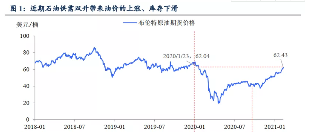 供需趋紧、库存回落是此轮原油价上行的主导因素。随着全球经济活动复苏,原油供需均在2020年中触底反弹。2020年9月前由于供给仍好于需求,油价回升幅度有限;2020年9月后需求恢复超过供给、原油库存回落,油价进入上行通道。