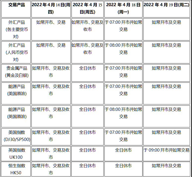 因应2022年4月15日(周五)为美国市场假期(耶稣受难节假期),本公司以下产品的交易时间将于假期期间作以下安排,敬请留意。