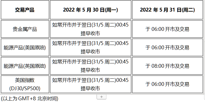 因应2022年5月30日(周一)为美国假期,本公司以下产品的交易时间将于假期期间作以下安排,敬请留意。