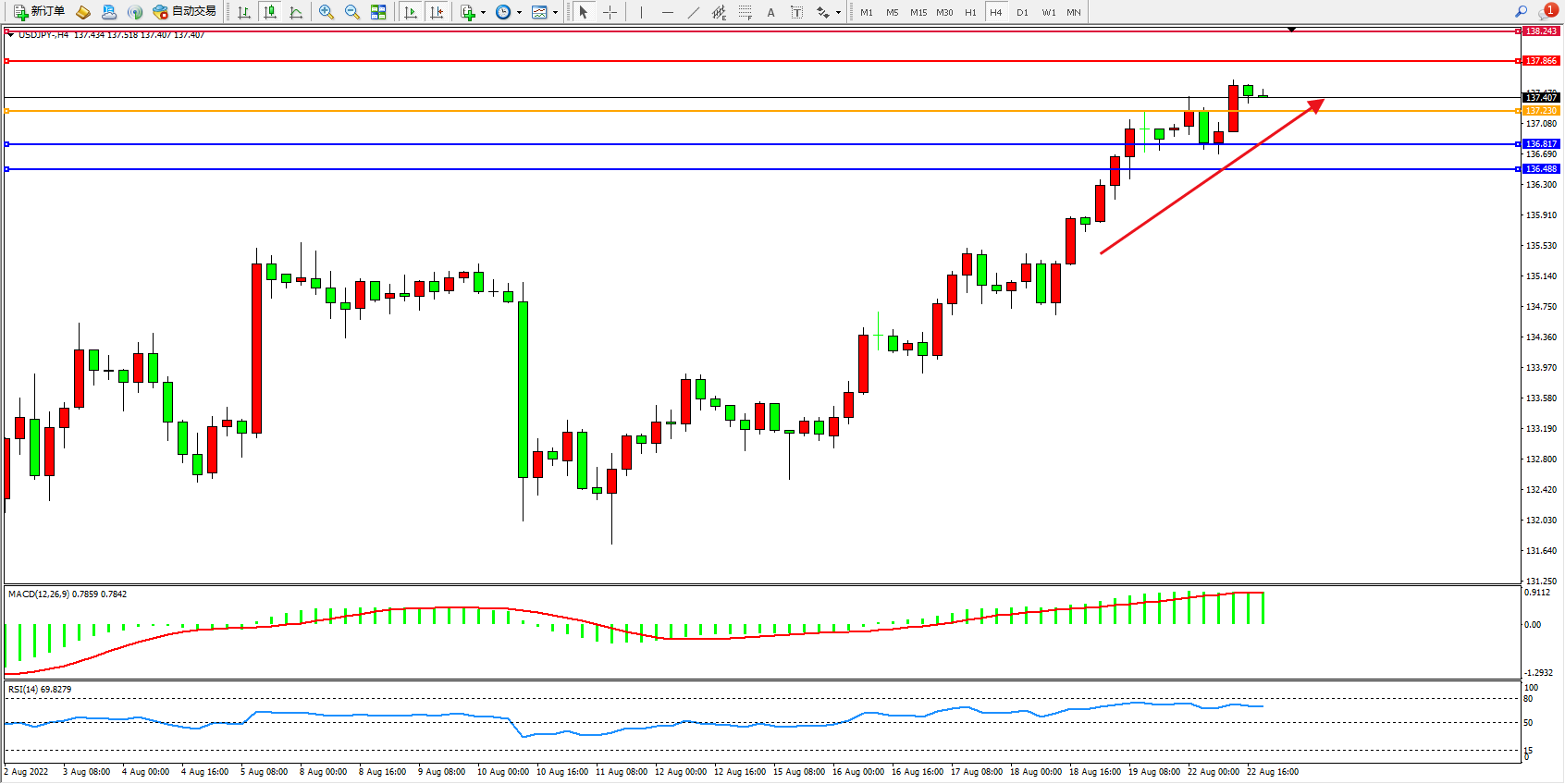 交易策略:137.230上方看涨,目标137.866、138.243